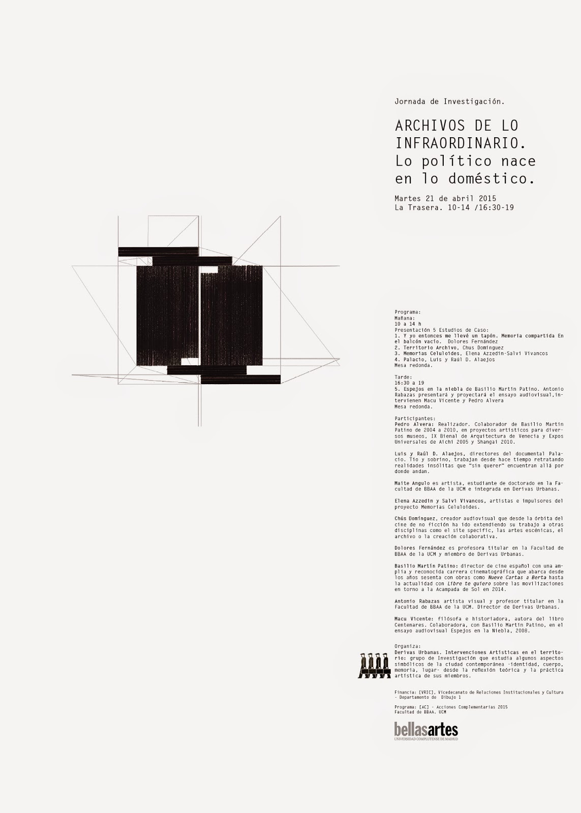ARCHIVOS DE LO INFRAORDINARIO. Lo político nace en lo doméstico es el título de una Jornada propuesta por el grupo de investigación Derivas Urbanas. Intervenciones Artísticas en el Territorio. Surge de la necesidad de profundizar y conocer de primera mano estrategias narrativas que están surgiendo en torno a las prácticas del espacio, en interés de las líneas de investigación del grupo y del proyecto de investigación doctoral de la estudiante Maite Angulo. Su objetivo principal es actualizar, conocer y debatir con los colectivos y artistas invitados, la naturaleza de sus procesos de creación y experimentación en torno a temas como la memoria, el archivo, el territorio y lo cotidiano.